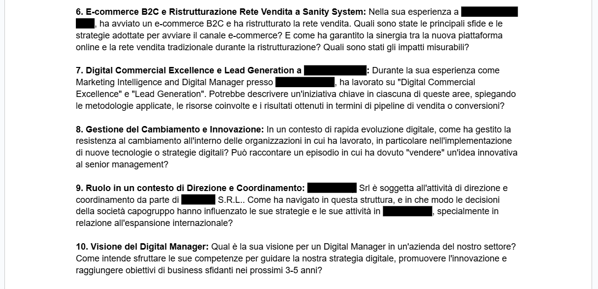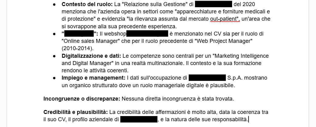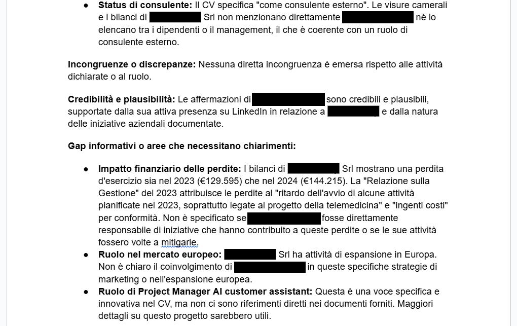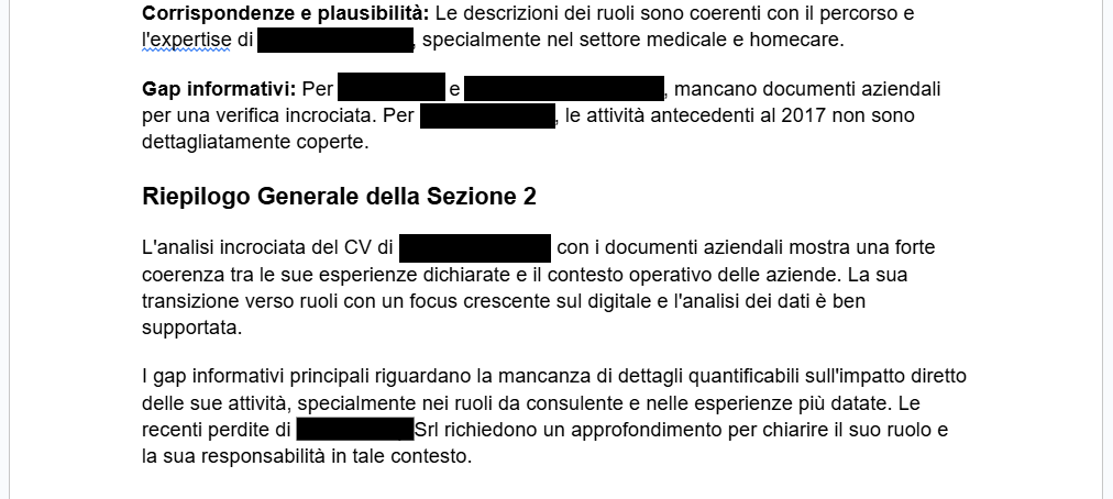Dopo l'analisi, Manager Facts ha redatto un report di 14 pagine, riportiamo alcune sezioni con gli omissis.